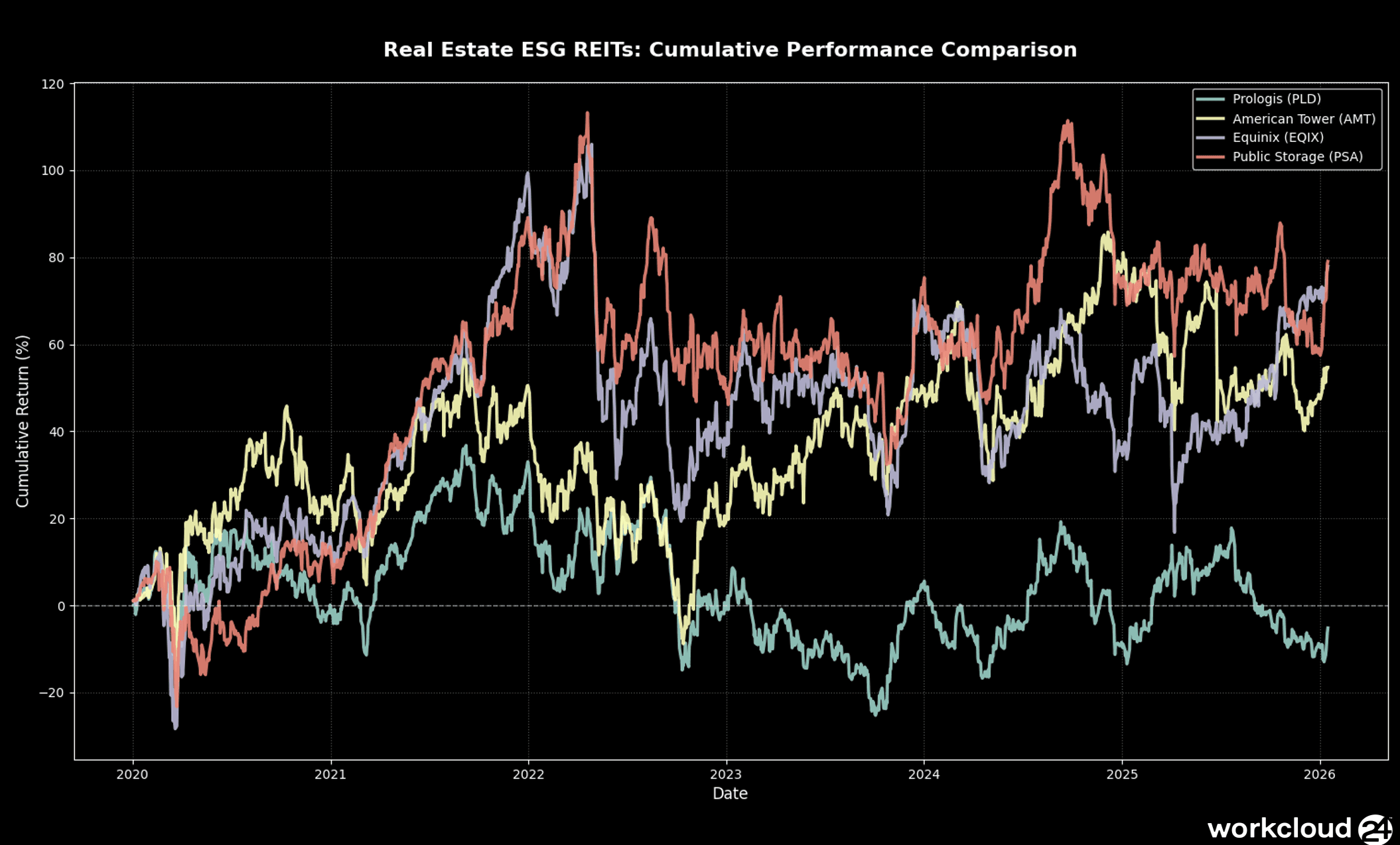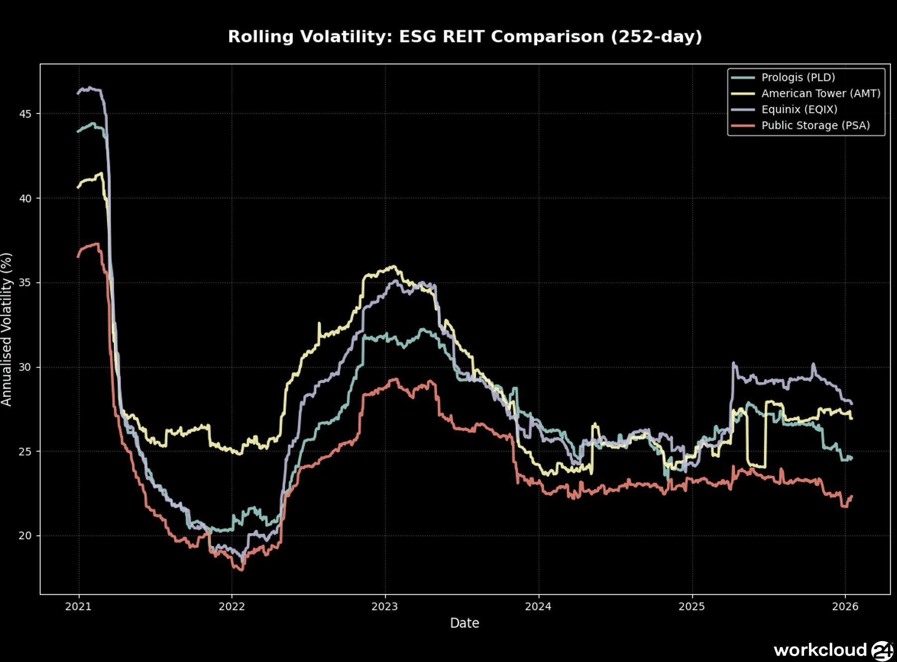 Equity ESG REITs offer a useful lens into how sustainability, real assets, and portfolio construction interact across cycles and the lessons are increasingly relevant for European and EU emerging market investors. Looking at global ESG-aligned real estate leaders across logistics, digital infrastructure, and storage, a few patterns stand out. These assets tend to compound steadily over time, but more importantly, they show distinct behaviour in drawdowns and volatility regimes. That downside behaviour often overlooked is where ESG integration in real assets becomes financially material.